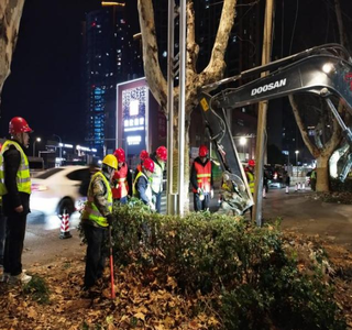 園林集團黨委自接到移植任務起,一是多次到項目現(xiàn)場調研,與相關單位反復論證,結合長江路法梧保護、交通通行、管線保護、周邊建筑和居民正常生活保障等多種因素,不斷優(yōu)化移植方案。二是選派優(yōu)秀黨員和業(yè)務骨干為移植施工現(xiàn)場責任管理人員,明確工作任務,克服起挖管線復雜、施工面小、冠幅回縮難度大的困難,集中力量、創(chuàng)造施工條件,攻堅克難。本次集中移植行動現(xiàn)場總計安排高空作業(yè)車3臺,挖機11臺,吊車10臺,隨車吊15臺、貨車13輛,投入黨員、職工200人次,最終順利完成移植,保障了長江路下穿工程項目建設進度。