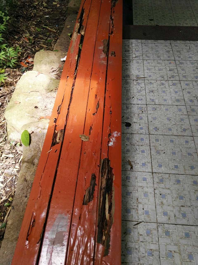 文明城市創(chuàng)建迎檢期間,公司對(duì)赭山公園內(nèi)的基礎(chǔ)設(shè)施進(jìn)行全面檢查,檢查中發(fā)現(xiàn)公園長(zhǎng)廊有部分座椅腐爛,在維修過(guò)程中發(fā)現(xiàn)長(zhǎng)廊座椅下有少量白蟻,因此,公司立即與白蟻防治所聯(lián)系。