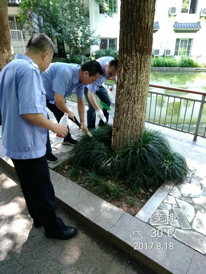 白蟻防治所工作人員到達(dá)現(xiàn)場(chǎng)后,告訴大家,近期受天氣影響,白蟻活動(dòng)頻繁,必須立即對(duì)白蟻進(jìn)行施藥處理,施藥后,保潔及時(shí)對(duì)地面殘留的藥物進(jìn)行沖洗。隨后,白蟻防治所工作人員檢查了公園其它地方,發(fā)現(xiàn)了有少量白蟻,于是工作人員立即在樹根下埋誘餌包進(jìn)行白蟻防治,并表示9月份將對(duì)公園白蟻防治情況進(jìn)行復(fù)查。