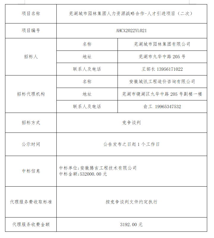 蕪湖城市園林集團人力資源戰(zhàn)略合作-人才引進項目(二次)中標(biāo)結(jié)果公示