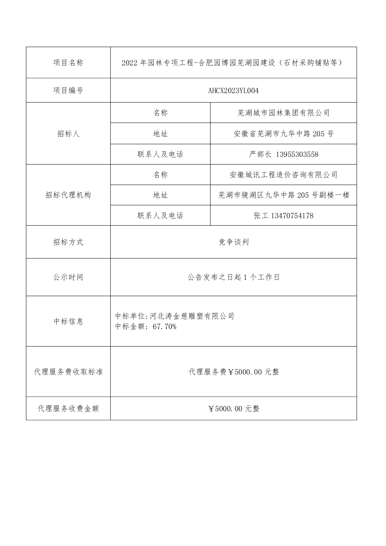 2022年園林專項工程-合肥園博園蕪湖園建設(石材采購鋪貼等)中標結(jié)果公