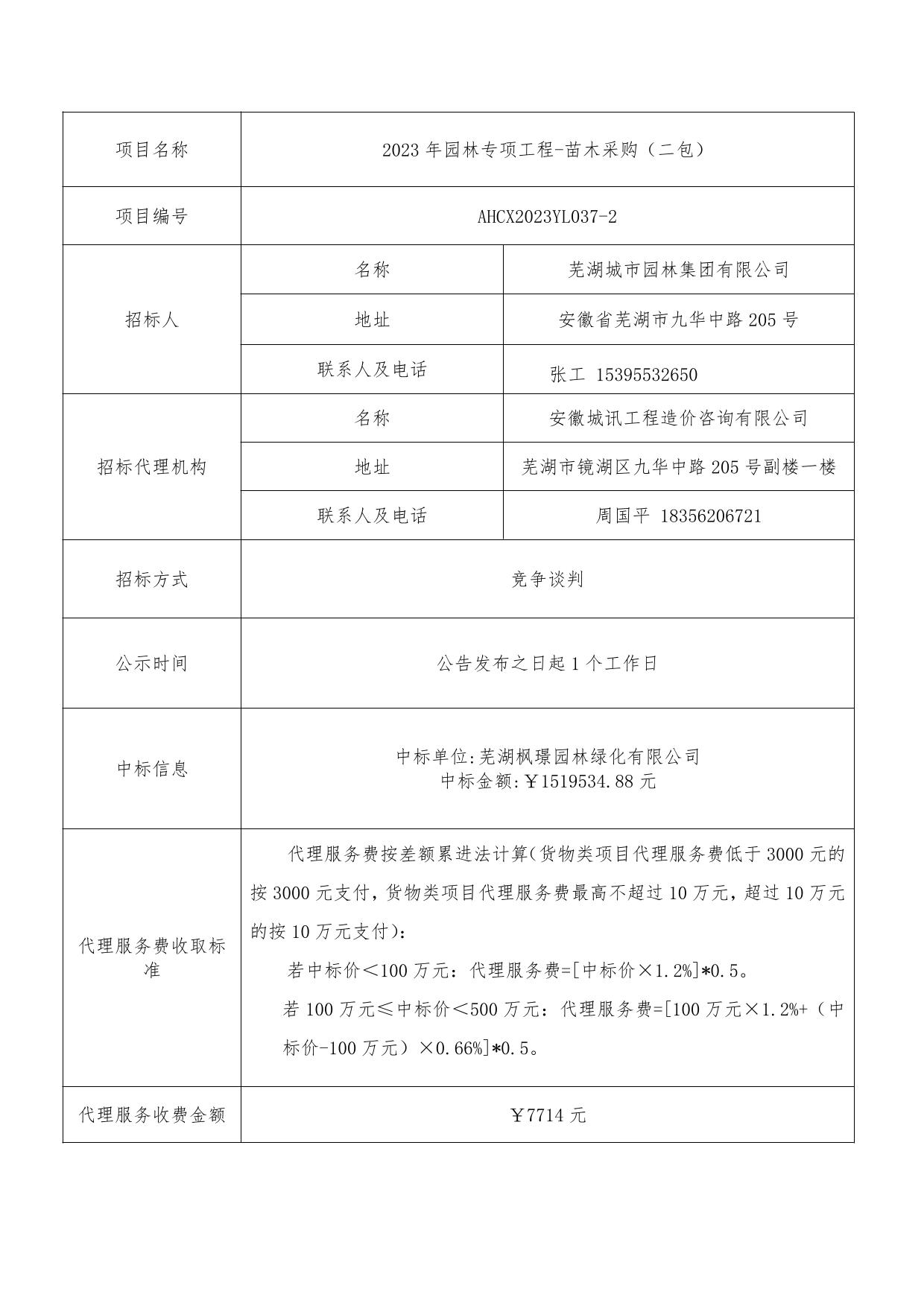 2023年園林專項(xiàng)工程-苗木采購(二包)中標(biāo)結(jié)果公示