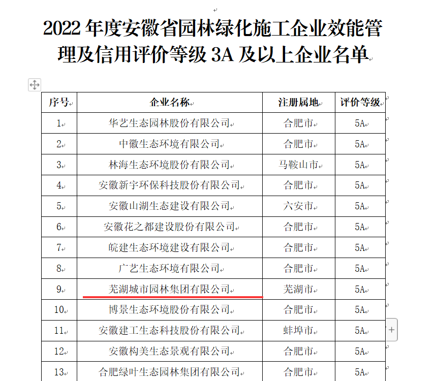 近日,2022年度安徽省園林綠化施工企業(yè)效能管理及信用評價結(jié)果公布,蕪湖城市園林集團(tuán)有限公司榮獲5A等級(最高)評價。