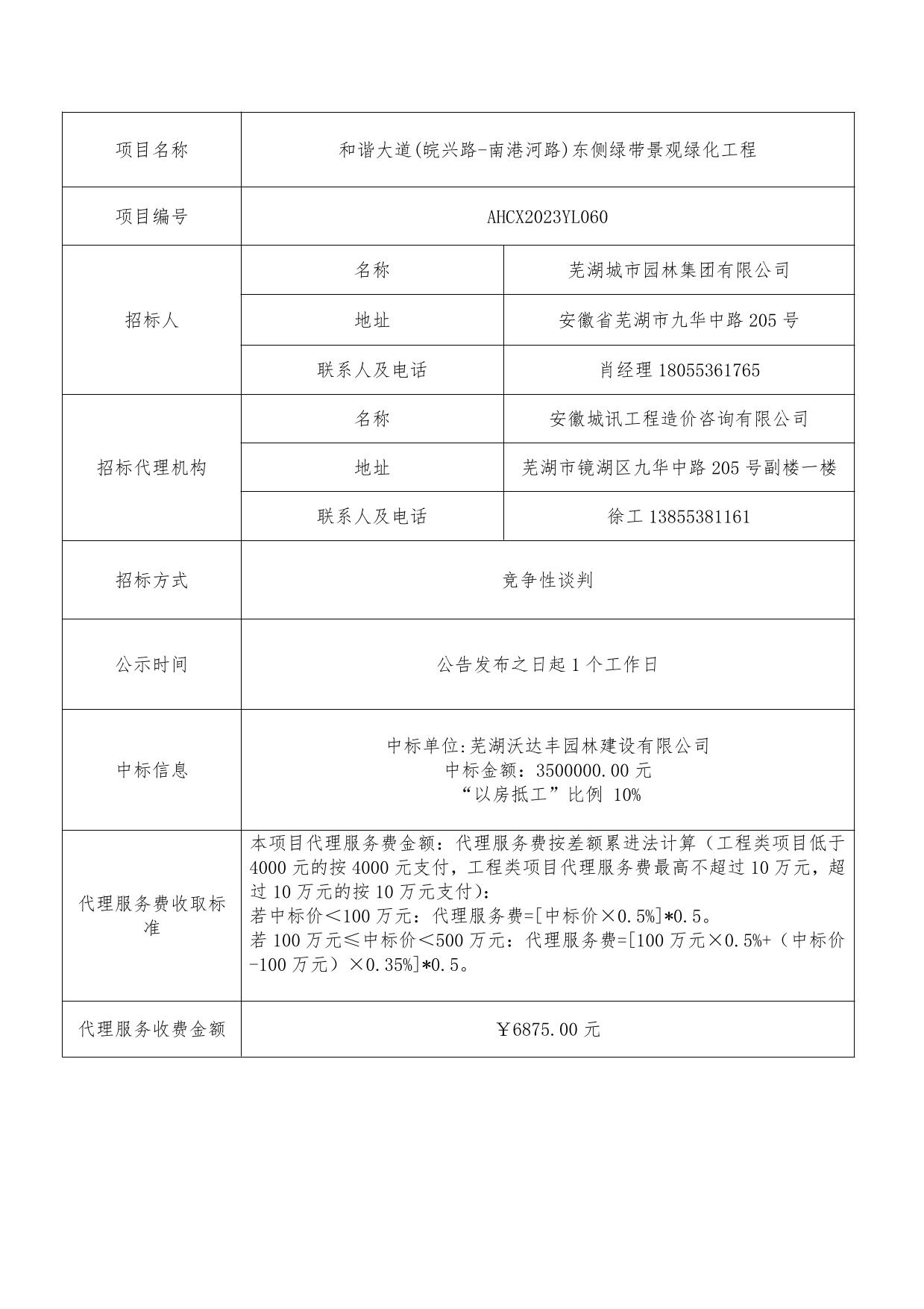 和諧大道(皖興路-南港河路)東側(cè)綠帶景觀綠化工程中標結(jié)果公示