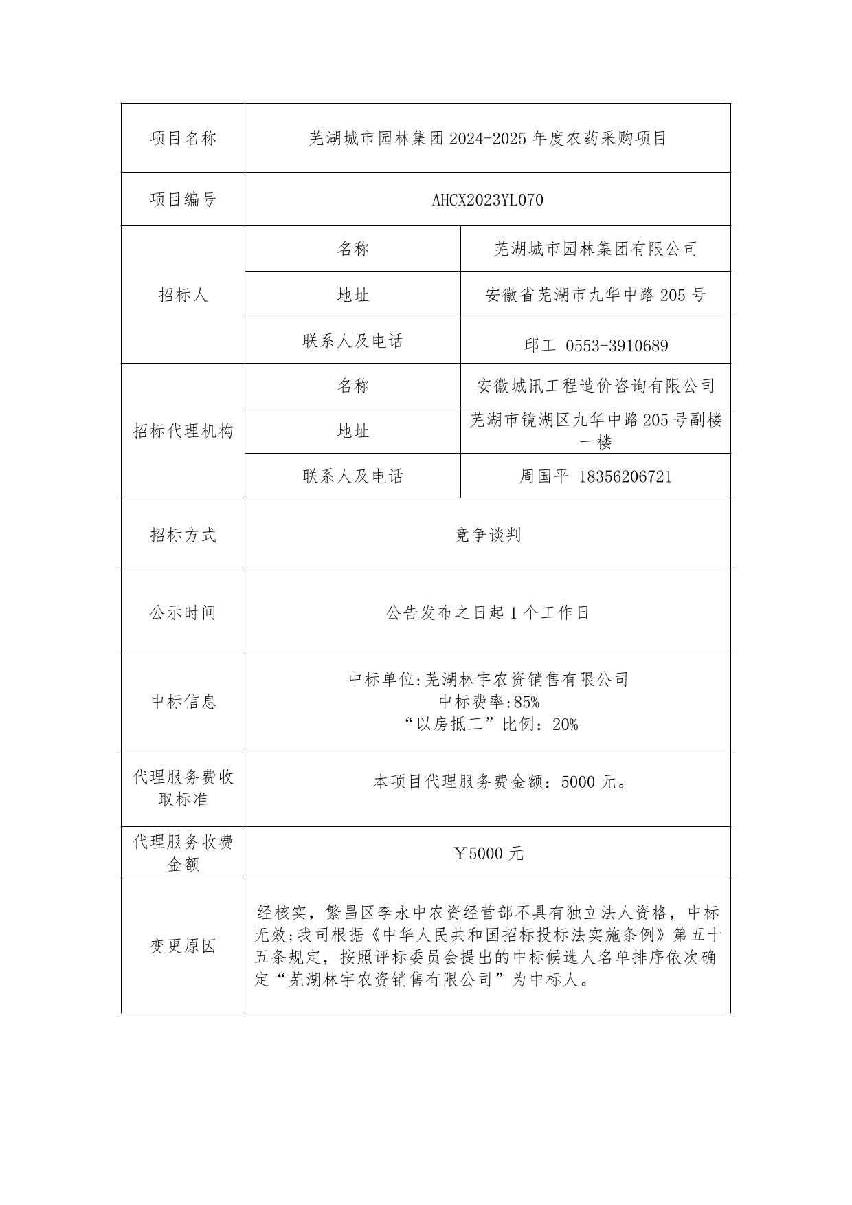 蕪湖城市園林集團2024-2025年度農(nóng)藥采購項目成交結(jié)果變更公告