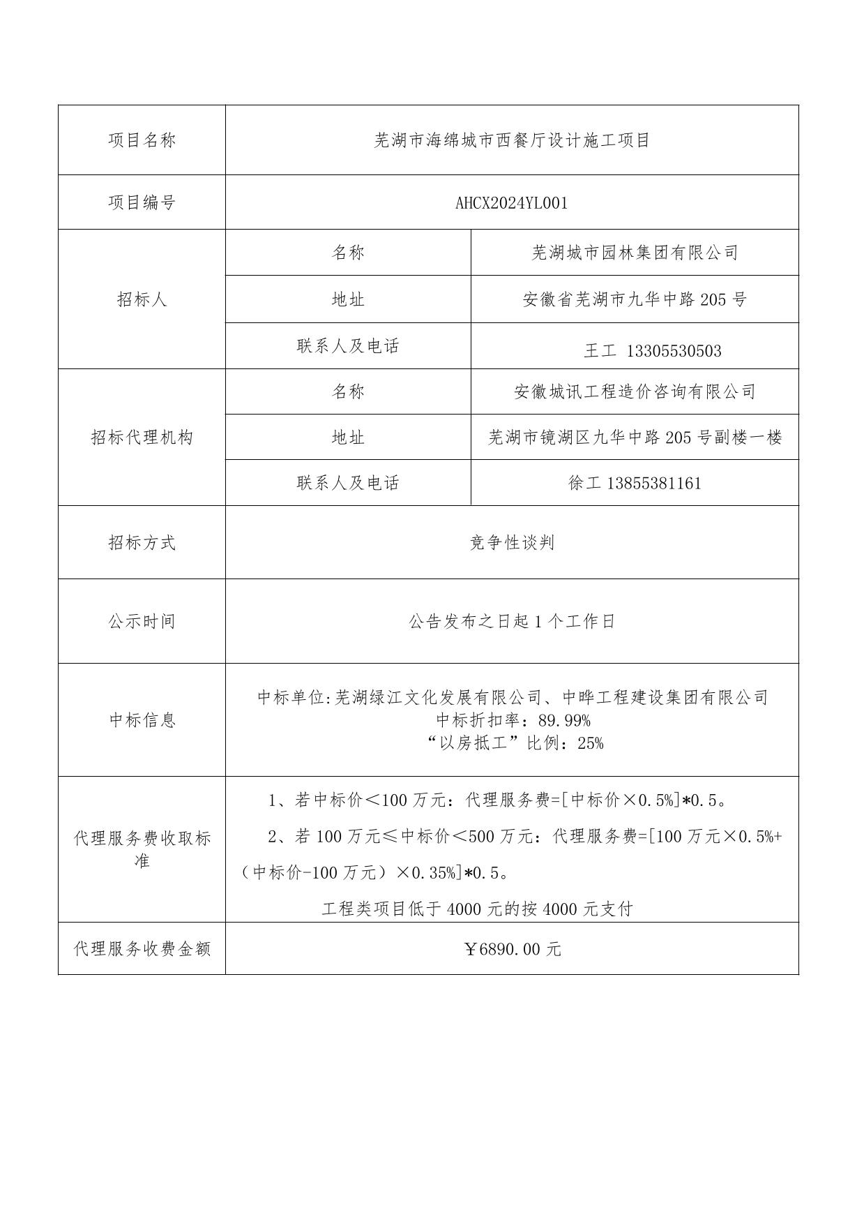 蕪湖市海綿城市西餐廳設(shè)計(jì)施工項(xiàng)目中標(biāo)結(jié)果公示