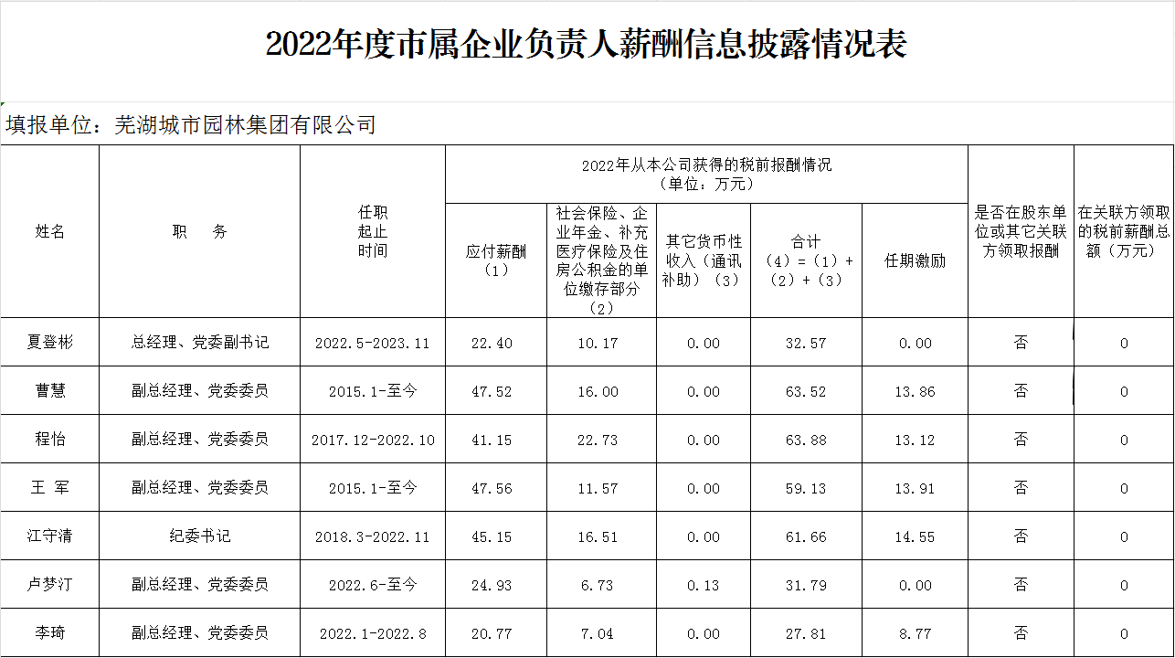 2022年度蕪湖城市園林集團(tuán)有限公司領(lǐng)導(dǎo)人員薪酬信息披露表