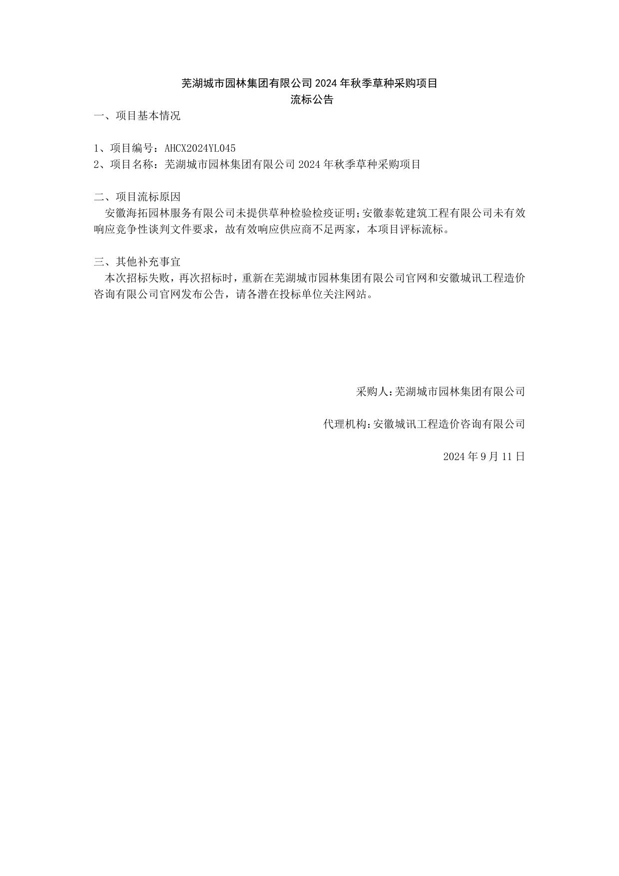 蕪湖城市園林集團(tuán)有限公司2024年秋季草種采購項(xiàng)目流標(biāo)公告